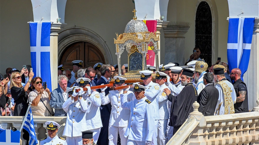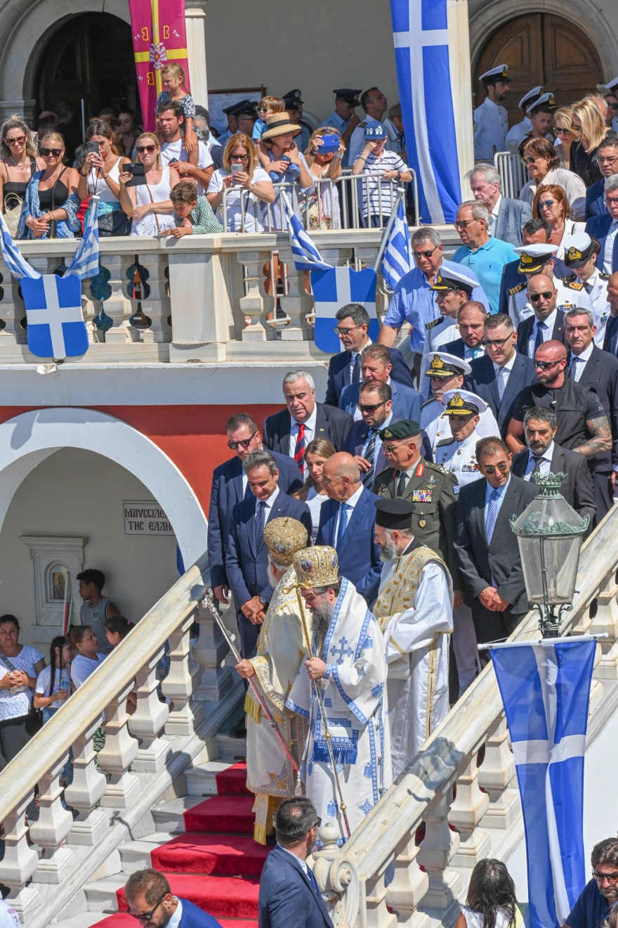 Στον εορτασμό της Κοιμήσεως της Θεοτόκου παρίστανται και ο υπουργός Εθνικής Άμυνας, Νίκος Δένδιας, συνοδευόμενος από τον αρχηγό ΓΕΕΘΑ Στρατηγό Κωσταντίνο Φλώρο ενώ μαζί με τον πρωθυπουργό βρίσκεται και η κόρη του Δάφνη.