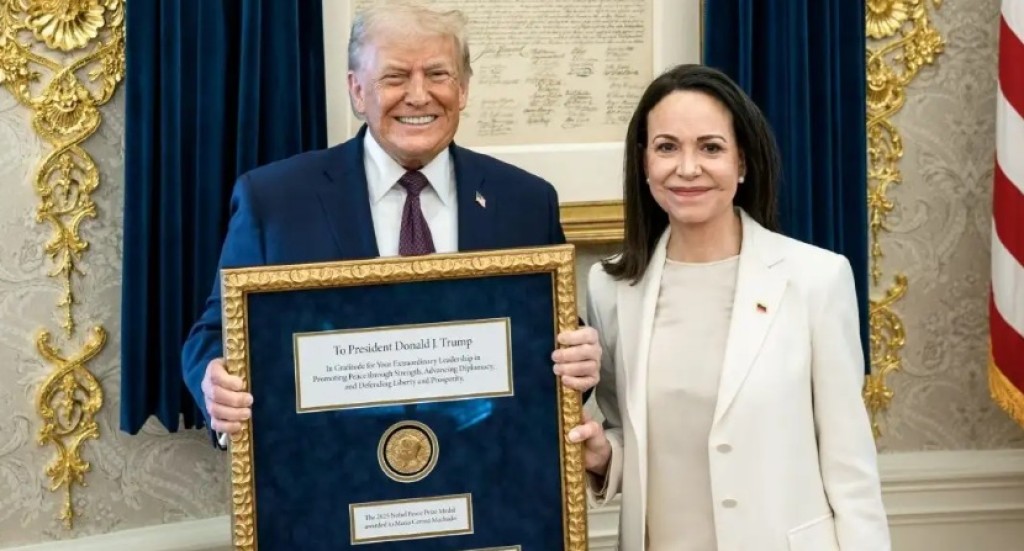 Το όνειρο του Αμερικανού προέδρου έγινε πραγματικότητα. Μπορεί ο Ντόναλντ Τραμπ να μην κέρδισε το Νόμπελ Ειρήνης το 2025 αλλά πλέον το κρατά στα χέρια του. Η Μαρία Κορίνα Ματσάδο, ηγέτιδα της αντιπολίτευσης της Βενεζουέλας, του παρέδωσε το Νόμπελ που κέρδισε τον Δεκέμβριο, σε μία κίνηση που προκαλεί αρκετά ερωτήματα.