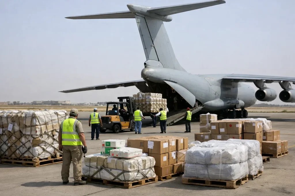 Σύμφωνα με πληροφορίες, η αποστολή περιλαμβάνει φάρμακα, τρόφιμα και απαραίτητα εφόδια για τους αμάχους, τους τραυματίες και τους εκτοπισμένους.