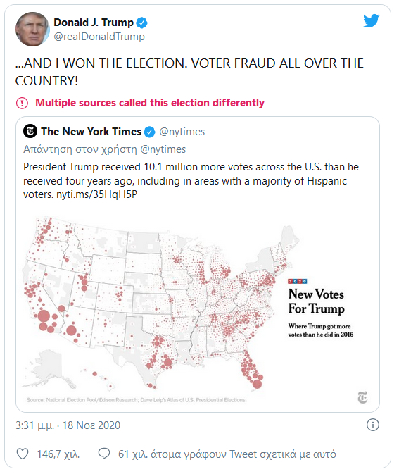 Ο Τραμπ αναδημοσίευσε ένα άρθρο των New York Times το οποίο επισημαίνει ότι έλαβε 10,1 εκατομμύρια ψήφους περισσότερες από ό,τι πριν από τέσσερα χρόνια. Ο Αμερικανός πρόεδρος σημειώνει πως «νίκησα στις εκλογές» και υπήρξε «εκτεταμένη νοθεία σε όλη τη χώρα».